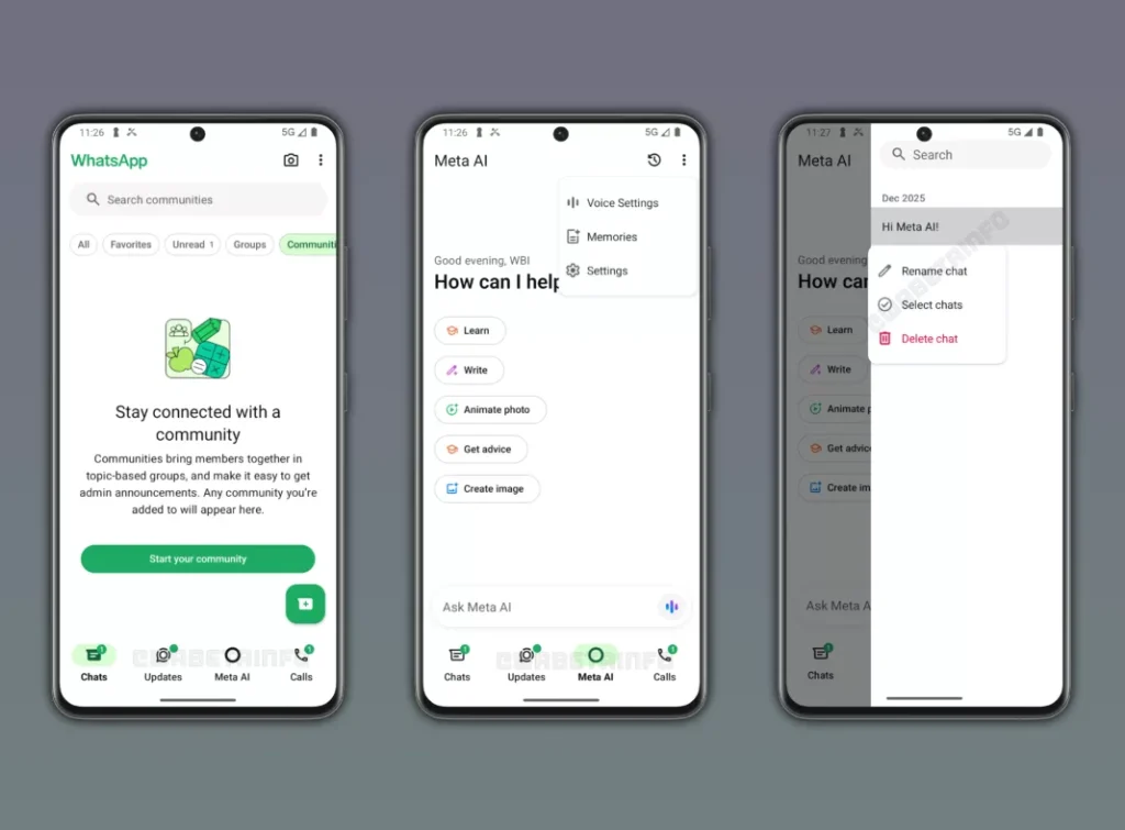 Yeni tasarım kapsamında uygulamadaki Topluluklar sekmesinin de yeri değiştirildi. Daha önce alt menüde bulunan bu bölüm, yeni güncelleme ile Sohbetler sekmesinin içine bir filtre olarak taşındı. Böylece alt menüde boşalan alan Meta AI sekmesine ayrılmış oldu.