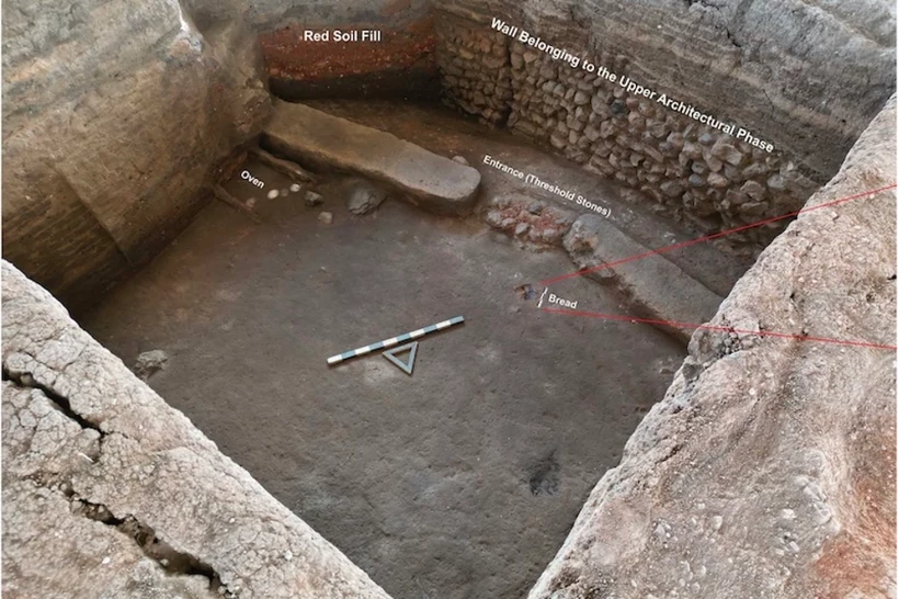 Yaklaşık 12 santimetre çapındaki bu özel ekmek, bir yapının girişine özenle bırakılmış ve üzeri kırmızı toprakla kapatılmış halde bulundu. Bu belirli düzen, ekmeğin sadece bir gıda maddesi değil; bir mekanın terk edilmesi ya da kutsanması sırasında gerçekleştirilen ritüelin bir parçası olabileceğini düşündürüyor.